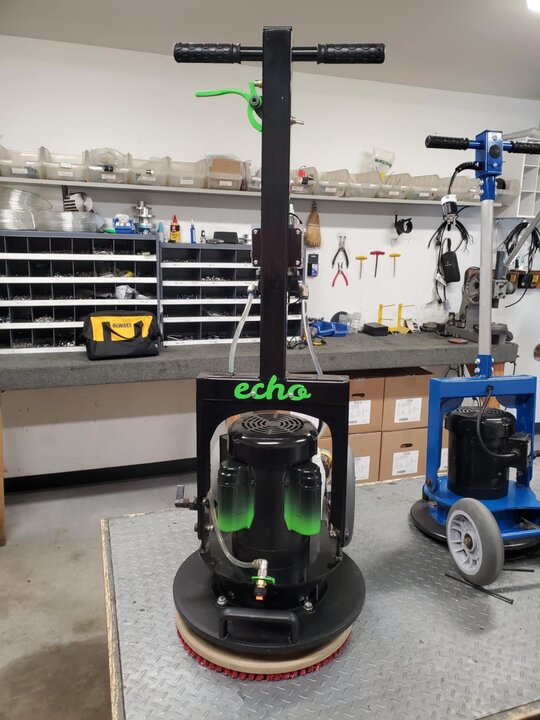 As you know I've built John's machines for over 10 years and worked with him since the days of the Profit, cm and the Conquerer. I designed the Echo from some of those older ideas, the 15 inch pad driver for better balance, wheels up for better maneuvering around anything. But I gave it a larger oscillation and designed it to be lighter than the older ones for the purpose of going up stairs. My goal was 90 pounds because I knew it would cancel most of the vibration at the handle making it smoother and easier to use even with the larger oscillation. And because its only 90 pounds and a couple other modifications it can be pulled up stairs with one hand. Thats never happened before with a Trinity.What differentiates it from John G’s old machines?Looks similar. I have two of John’s machines. A Profit and a Champ. What I found was fastest in big commercial buildings was a Mytee variable speed rotary with 3 gallon solution tank and front wide spray nozzle it has a lever on the left side handle to spray cleaning solution. You can also angle the spray tip in you want to walk it sideways..slower speeds make the pads really hook up.