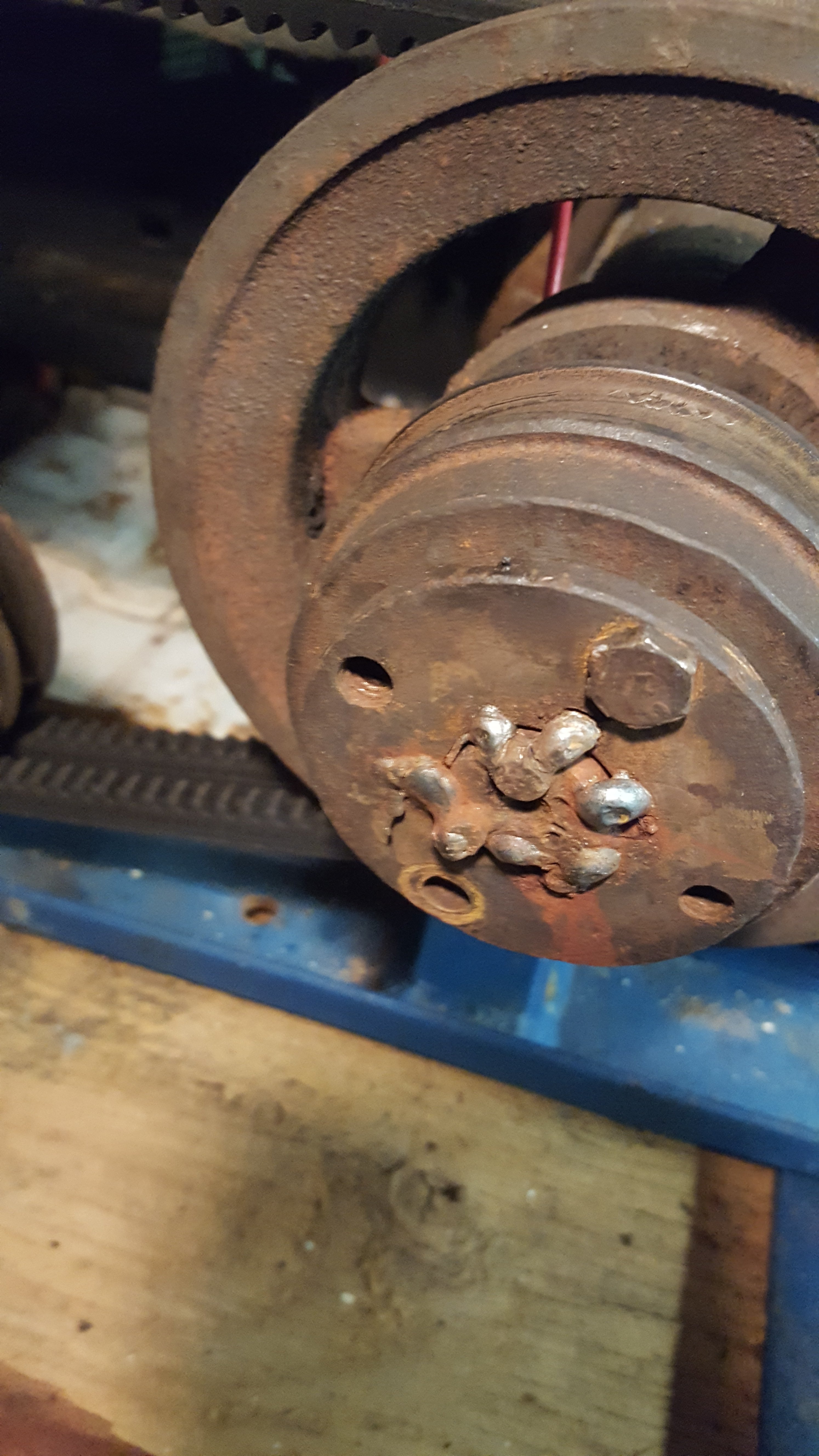Cut those welds carefully...then use those other two holes to push that pulley shieve off....
