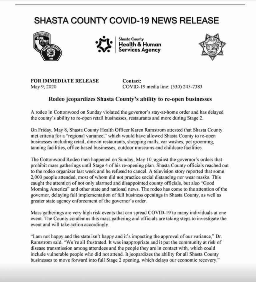 Ca Gov delays reopening Shasta County as a punishment for the Cottonwood Rodeo. Lovely.